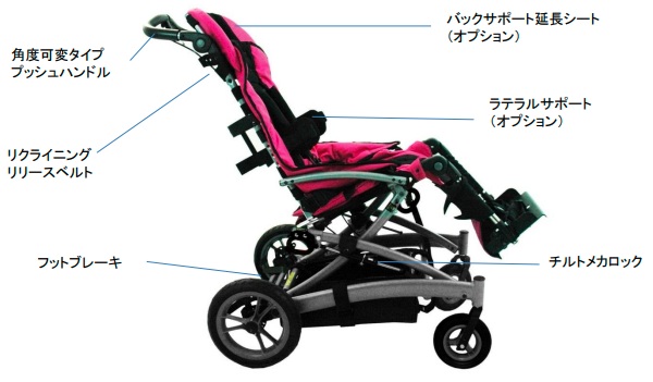 ティルト(背シートと座シートの角度を固定したまま、後ろに倒すことが出来る)や、リクライニング(背シートが後ろに倒れる)をすることが出来るのが、障がい児用用バギーの最大の特徴かと思います。